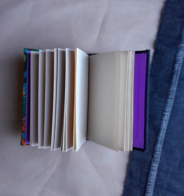 15 x 11 centímetros. Encuadernación tradicional con lomo. Tapas de cartón reutilizado, 80 hojas de caña de azúcar.